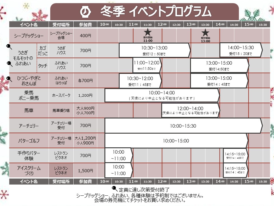 【冬季期間イベントスケジュール】※積雪等、天候によって中止になる場合がございます。